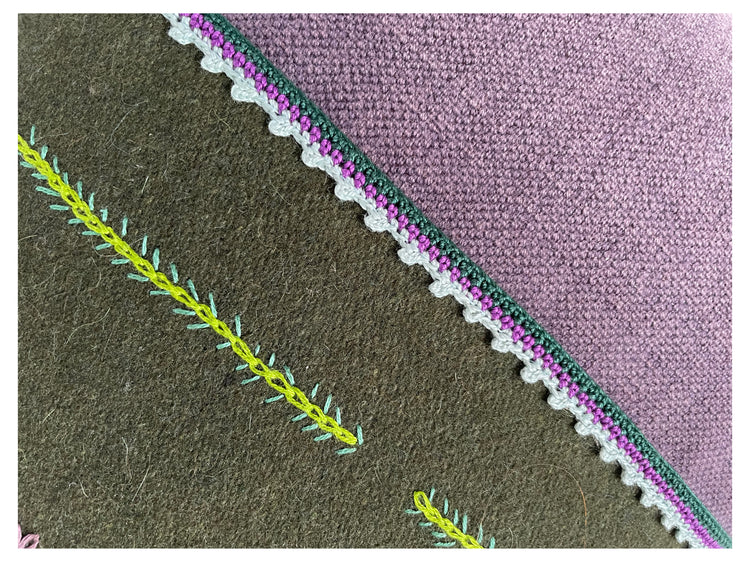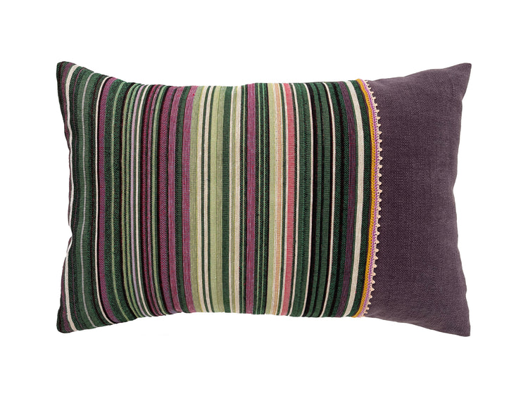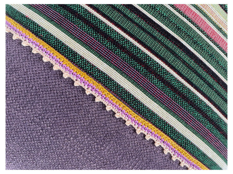 Sierkussen met groen en paars. De groene stof aan de voorzijde is opgefleurd met diverse siersteken. Het kussen heeft aan beide zijden een door de Wereldwijven gehaakt bandje.
