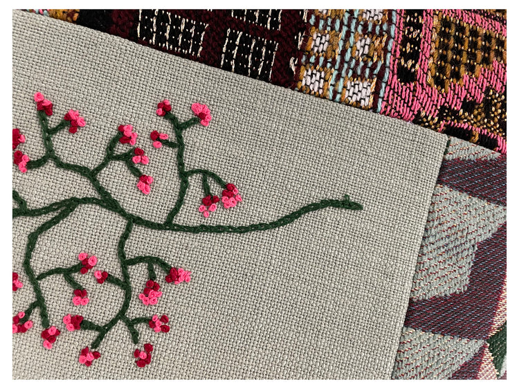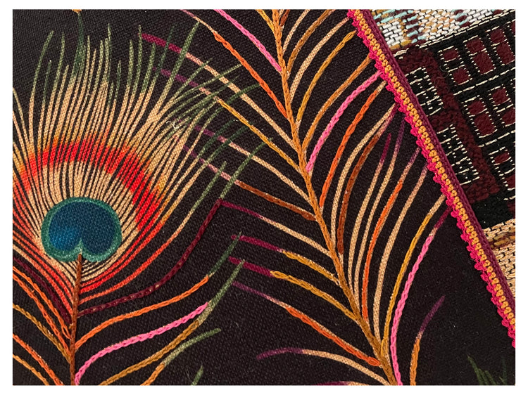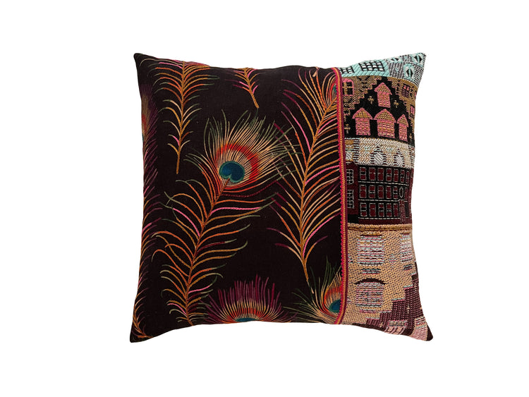 Sierkussen met pauwenveren en Japanse bloesem. De stof met pauwenveren is door onze Wereldwijven bewerkt met kruissteekjes en kettingsteekjes. Op de stof aan de achterzijde is Japanse bloesem geborduurd. Het kussen heeft aan de voorzijde een door de Wereldwijven gehaakt bandje.