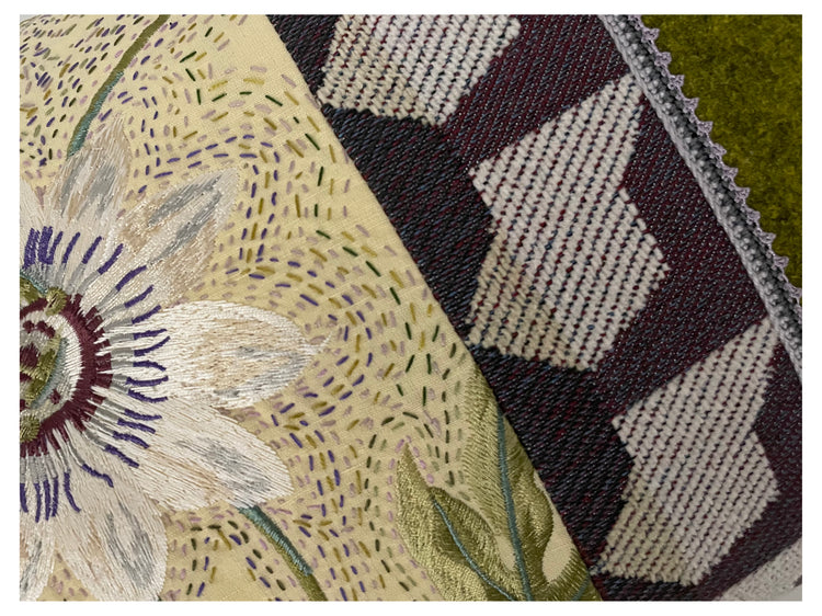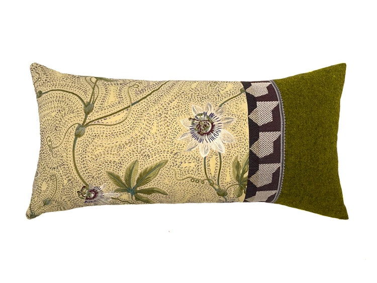 Sierkussen met passiebloemen. De gebloemde stof is door de Wereldwijven opgevuld met rijgsteekjes. De geometrische stroken aan beide kanten van het kussen zijn de voor- en achterkant van dezelfde stof. Aan de achterzijde van het kussen zijn lijnen geborduurd. Het kussen heeft aan beide zijden een door de Wereldwijven gehaakt bandje.