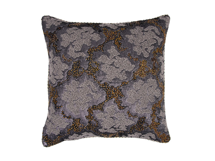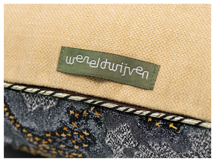 Sierkussen met jacquard gewoven stof met metaaldraad. De abstracte vormen van de stof zijn door onze Wereldwijven opgefleurd met kruissteekjes. Het kussen is rondom afgewerkt met een pipingband.