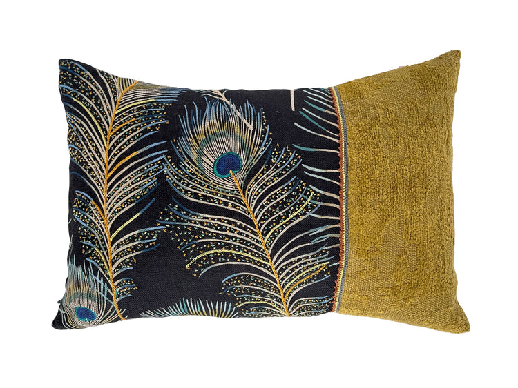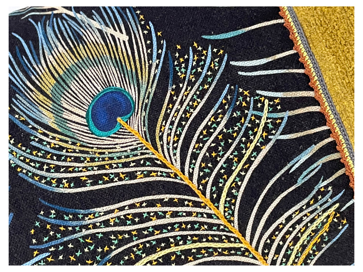 Sierkussen met pauwenveren. De stof met pauwenveren is door onze Wereldwijven bewerkt met kruissteekjes en kettingsteekjes. Het kussen heeft aan beide zijden een door de Wereldwijven gehaakt bandje.