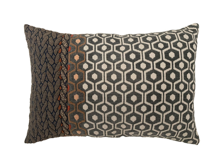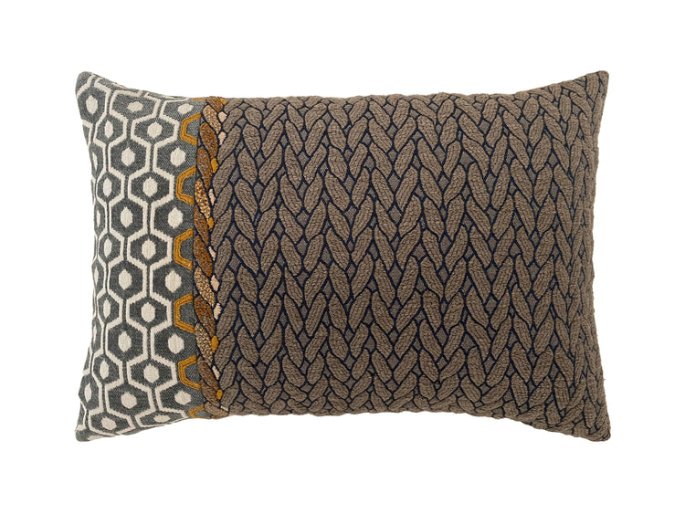 Sierkussen met grafische print. Aan beide zijden van het kussen is door de Wereldwijven een baan geborduurd met diverse borduursteken.