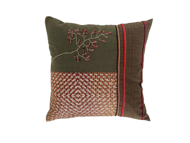 Sierkussen met bloesem. Het blad met bloesem is door onze Wereldwijven op de stof geborduurd met steelsteekjes en franse knoopjes. In de tweed stof zijn strepen gemaakt met kettingsteekjes. Het kussen heeft aan beide zijden een gehaakt bandje.