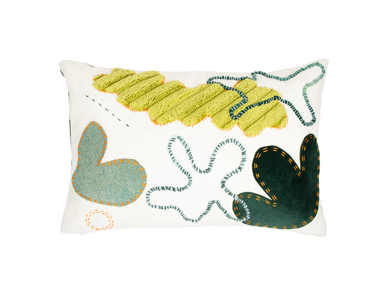Sierkussen met organische vormen. Aan de voorzijde van het kussen zijn bladmotieven aangebracht met diverse lapjes stof en borduursteken. De stof aan de achterzijde is niet geborduurd.