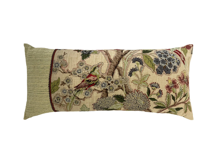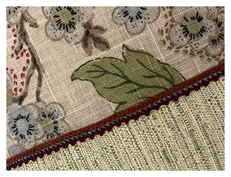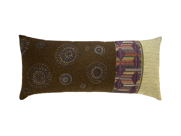 Sierkussen met spiralen en vogels. Aan de voorzijde van het kussen zijn door de Wereldwijven spiralen geborduurd. Rondom de stof met vogels aan de achterzijde zijn rijgsteekjes geborduurd. Het kussen heeft aan beide zijden een door de Wereldwijven gehaakt bandje.